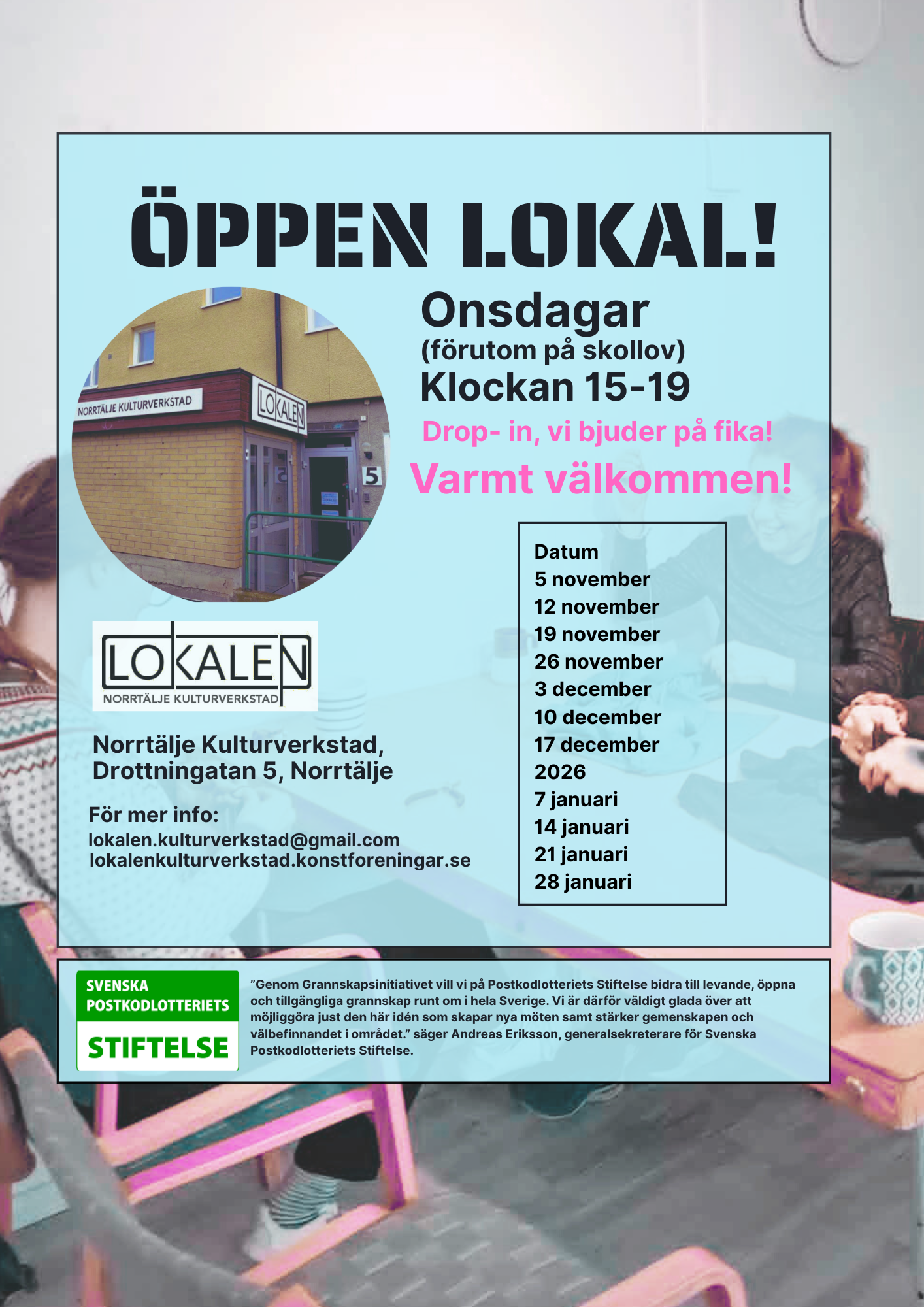 Vi kommer erbjuda enklare aktiviteter i olika konstformer – från keramik och grafik till collage och måleri, men man kan också ta med sitt eget projekt, stickning eller bok att läsa – i kombination med fika och samtal. Genom detta skapar vi en inkluderande plats där kulturen och kreativiteten bidrar till gemenskap, tillhörighetskänsla och välmående.